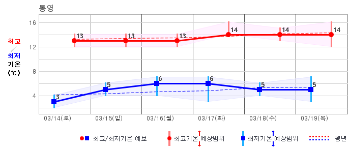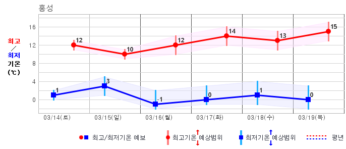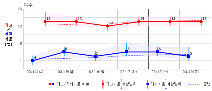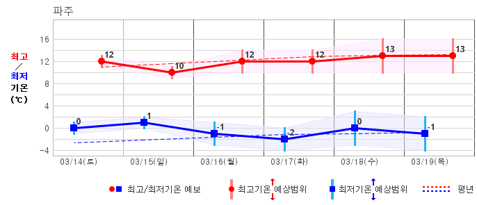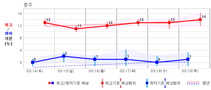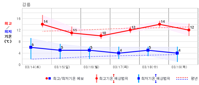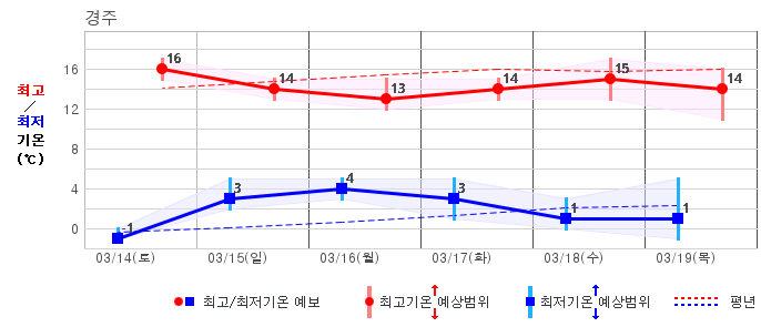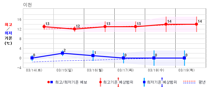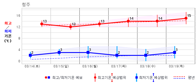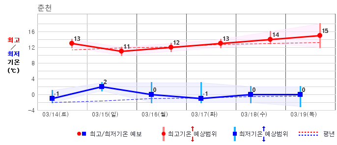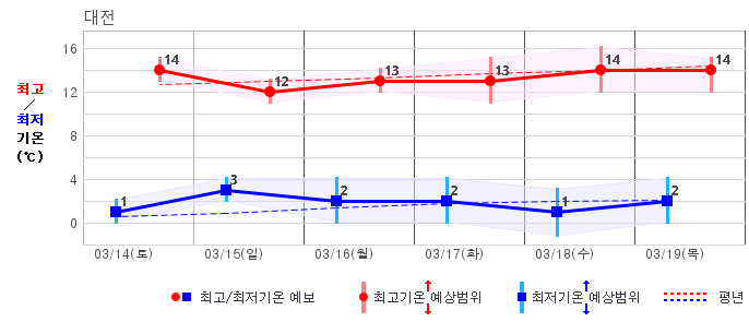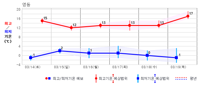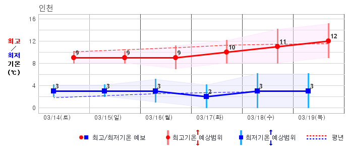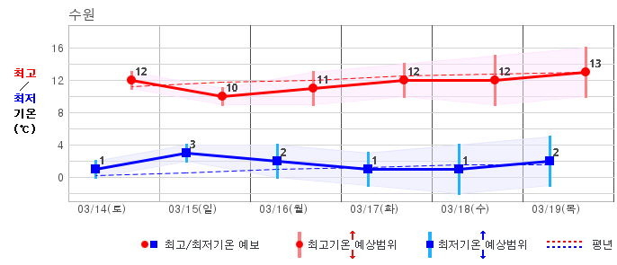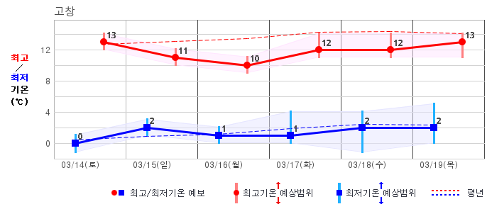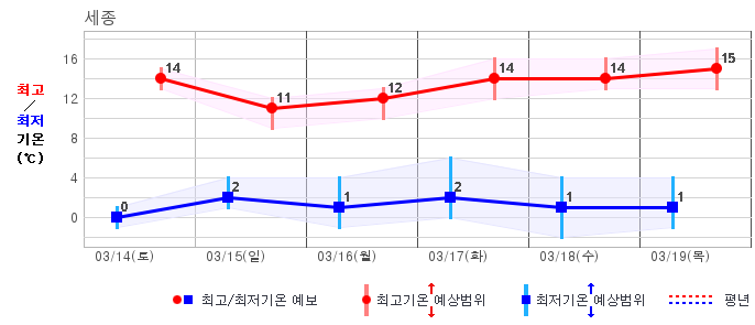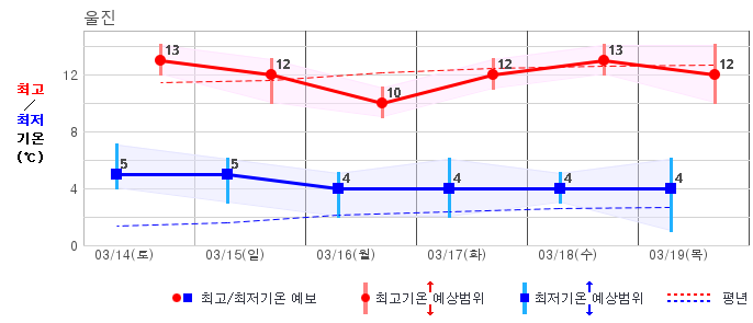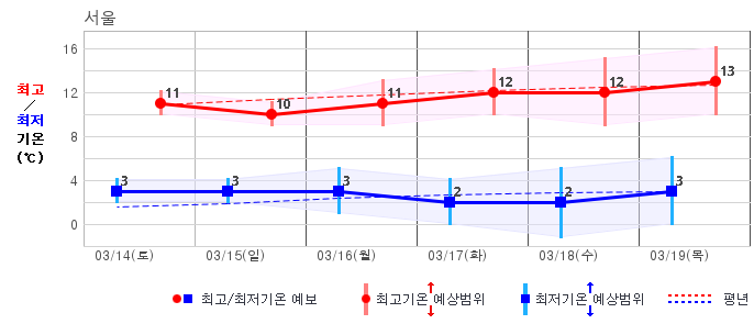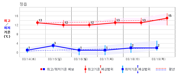 ○ (하늘상태) 이번 예보기간에는 전국이 가끔 구름많겠습니다. ○ (기온) 이번 예보기간 아침 기온은 -1~8℃, 낮 기온은 9~16℃로 평년(최저기온 -2~6℃, 최고기온 10~16℃)과 비슷하겠습니다. ○ (주말전망) 14일(토)~15일(일) 전국이 가끔 구름많겠습니다. 아침 기온은 -1~7℃, 낮 기온은 9~16℃가 되겠습니다.