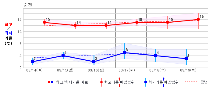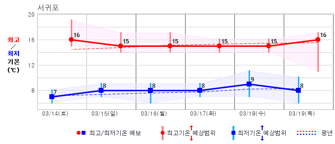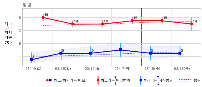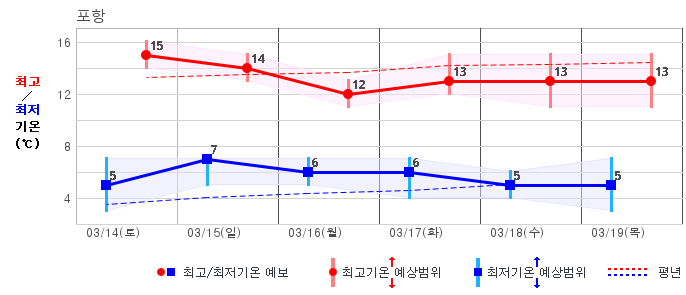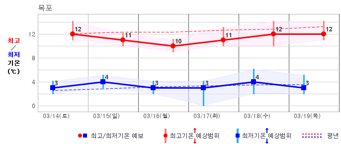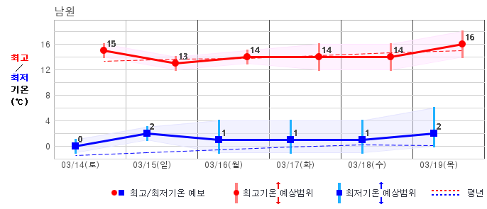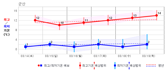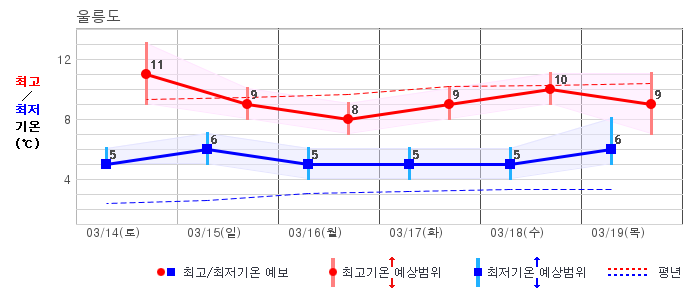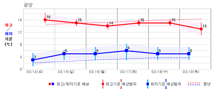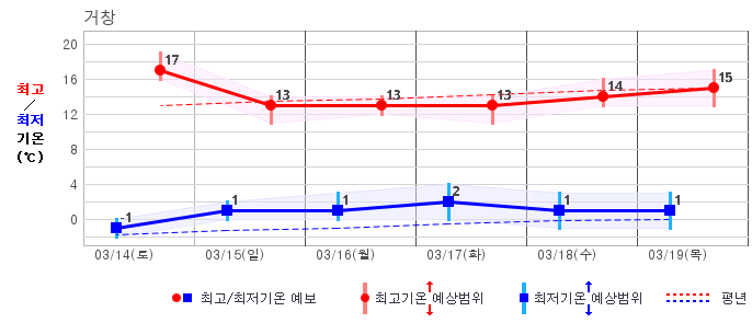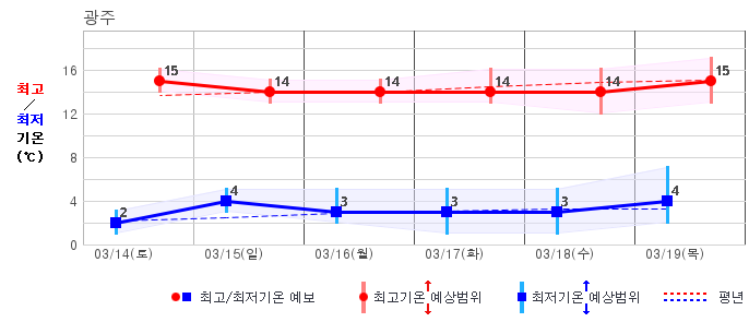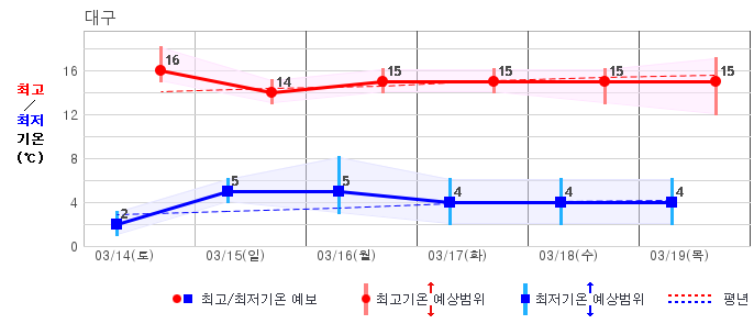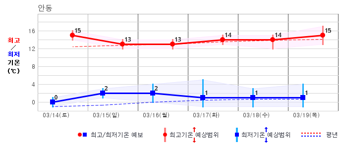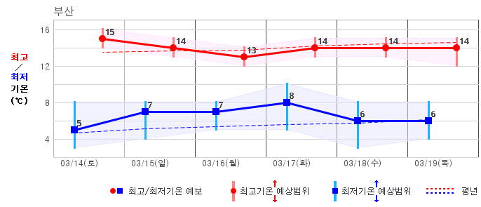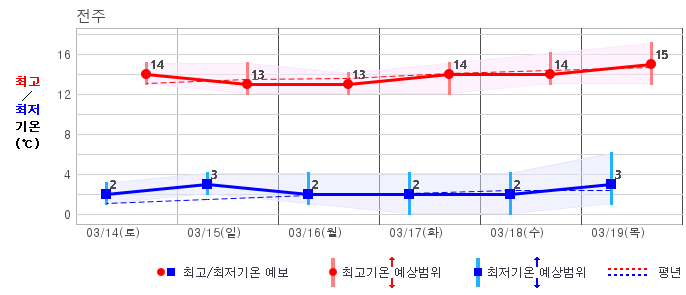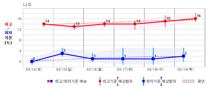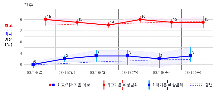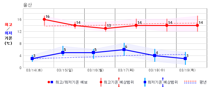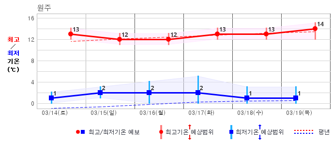 ○ (하늘상태) 이번 예보기간에는 전국이 가끔 구름많겠습니다. ○ (기온) 이번 예보기간 아침 기온은 -1~8℃, 낮 기온은 9~16℃로 평년(최저기온 -2~6℃, 최고기온 10~16℃)과 비슷하겠습니다. ○ (주말전망) 14일(토)~15일(일) 전국이 가끔 구름많겠습니다. 아침 기온은 -1~7℃, 낮 기온은 9~16℃가 되겠습니다.